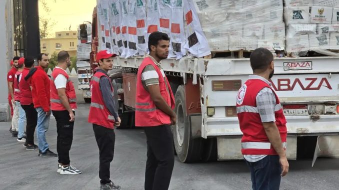 Segundo a emissora egípcia Al Qahera News, longas filas de veículos aguardavam na passagem de Rafah, na fronteira com o Egito, para seguir em direção ao território palestino. Parte da ajuda também deve ser encaminhada por outros pontos de entrada controlados por Israel, como Kerem Shalom e al Awja, conforme previsto no acordo.